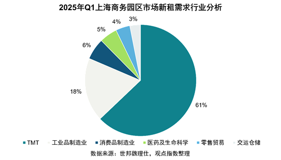市場新租需求方面,據(jù)世邦魏理仕披露,上海市場TMT行業(yè)以61%的占比保持租賃需求首位,其中短視頻、網(wǎng)絡(luò)游戲和平臺互聯(lián)網(wǎng)的需求旺盛,其次是軟件系統(tǒng)開發(fā)、電商類企業(yè)以及人工智能相關(guān)需求。工業(yè)品制造業(yè)以18%的占比位列第二,主要趨勢為半導(dǎo)體與芯片企業(yè)的搬遷。