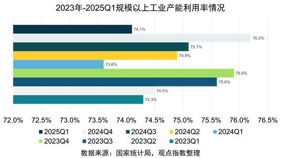此外,2025年一季度全國規(guī)模以上工業(yè)產(chǎn)能利用率為74.1%,比上年同期上升0.5個百分點(diǎn),較2024年末下降2.1個百分點(diǎn)。其中,汽車制造業(yè)的產(chǎn)能利用率為71.9%,同比增加幅度最大,為7個百分點(diǎn),醫(yī)藥制造業(yè)產(chǎn)能利用率為72.5%,同比下降幅度最大,為3.5個百分點(diǎn)。