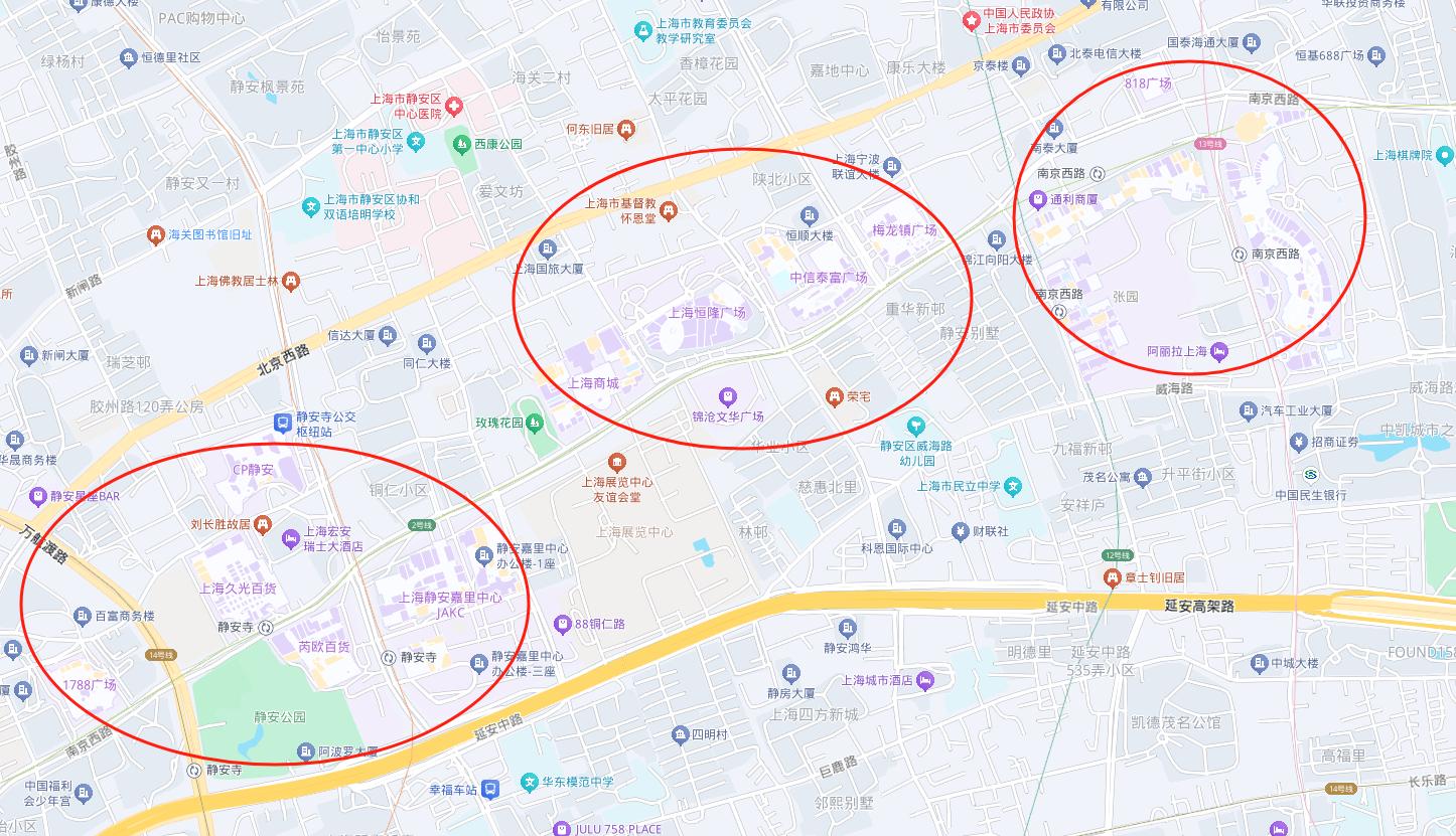 就目前而言,南京西路商圈內(nèi)主要商場分布在3個區(qū)域。