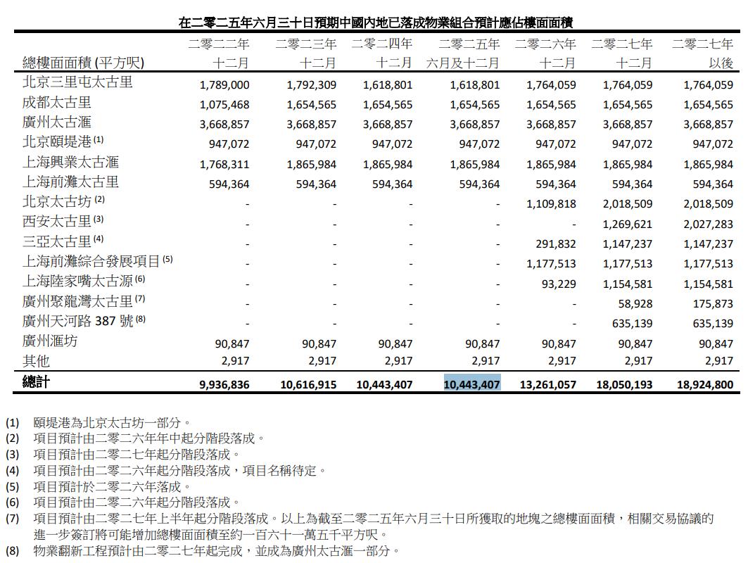 其中,北京太古坊預(yù)計(jì)在2026年年中起分階段落成,之后將整合北京頤堤港;西安太古里預(yù)計(jì)在2027年分階段落成;三亞太古里預(yù)計(jì)在2026年起分階段落成。