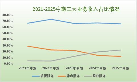 但2021-2025年中期期間,品牌及管理輸出服務(wù)的收入占比從最早期的34.7%持續(xù)下滑至12.10%,反倒毛利率最低的整租服務(wù)占比在持續(xù)提升,從2021年末的3.8%提升至22.6%。