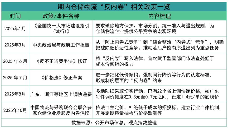 8月起,廣東、浙江等22個(gè)省份陸續(xù)調(diào)整快遞價(jià)格,調(diào)價(jià)幅度在0.3元至0.7元之間,如廣東設(shè)定1.4元/單的底線價(jià),通過(guò)價(jià)格機(jī)制改革遏制低價(jià)傾銷(xiāo)行為;10月,中國(guó)物流與采購(gòu)聯(lián)合會(huì)聯(lián)合多家倉(cāng)儲(chǔ)企業(yè)發(fā)起反內(nèi)卷倡議,提出依法自主定價(jià)、杜絕低于成本的招投標(biāo)、建立行業(yè)自律機(jī)制、開(kāi)展定期質(zhì)量抽檢與價(jià)格監(jiān)測(cè)等措施,多家快遞企業(yè)調(diào)整經(jīng)營(yíng)戰(zhàn)略,將競(jìng)爭(zhēng)重心從規(guī)模擴(kuò)張轉(zhuǎn)向服務(wù)品質(zhì)提升。