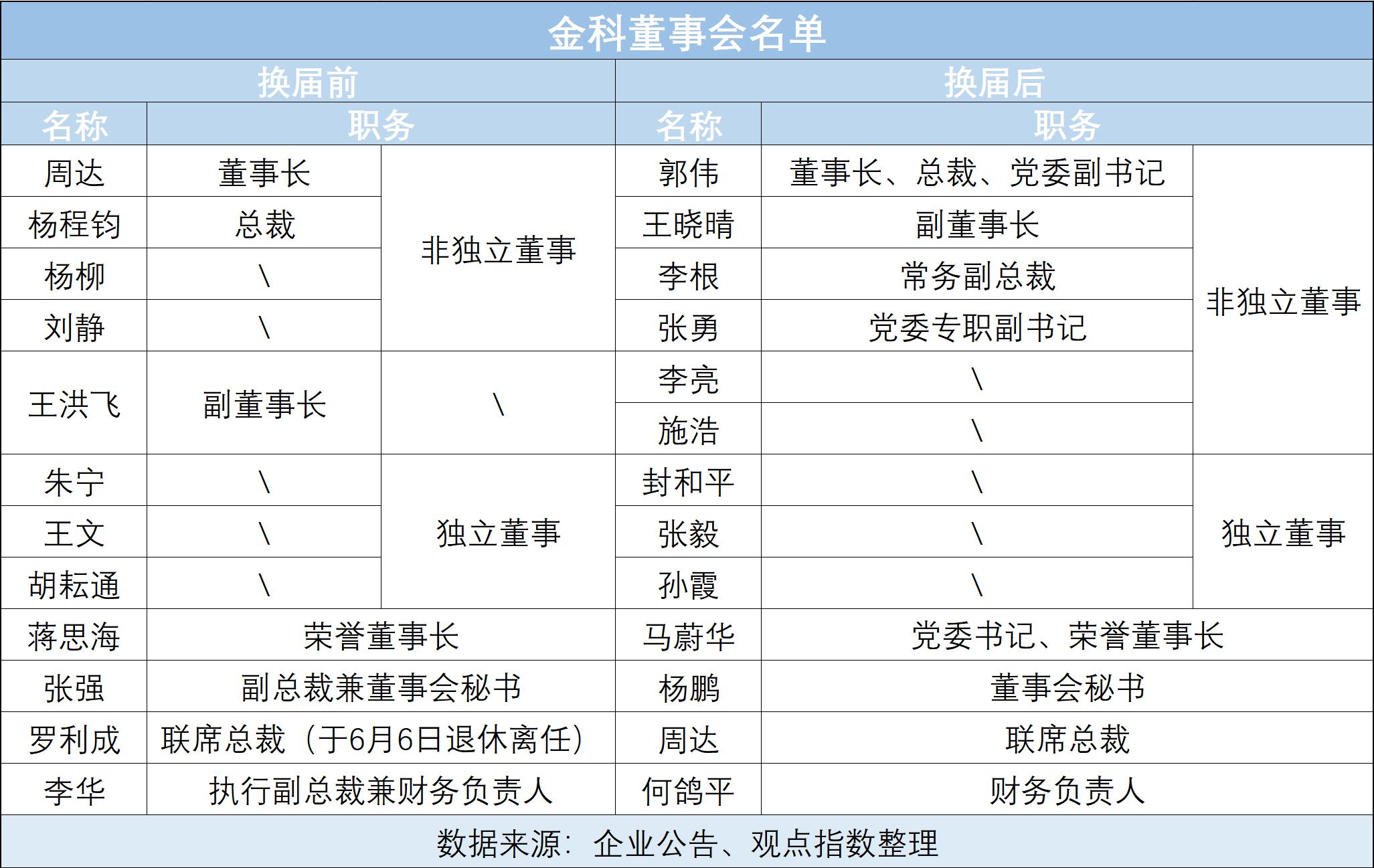 具體來(lái)看,郭偉獲任金科股份董事長(zhǎng)、總裁、黨委副書記,王曉晴任副董事長(zhǎng),周達(dá)為聯(lián)席總裁,李根為常務(wù)副總裁,張勇為黨委專職副書記,楊鵬為董事會(huì)秘書,何鴿平為財(cái)務(wù)負(fù)責(zé)人。