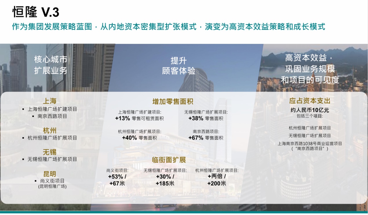 “V.3”策略是恒隆聚焦核心項(xiàng)目的精耕細(xì)作,面對(duì)市場(chǎng)飽和、競(jìng)爭(zhēng)加劇及拿地成本高企的新環(huán)境,恒隆在“V.2”策略成功基礎(chǔ)上進(jìn)行了升級(jí)。