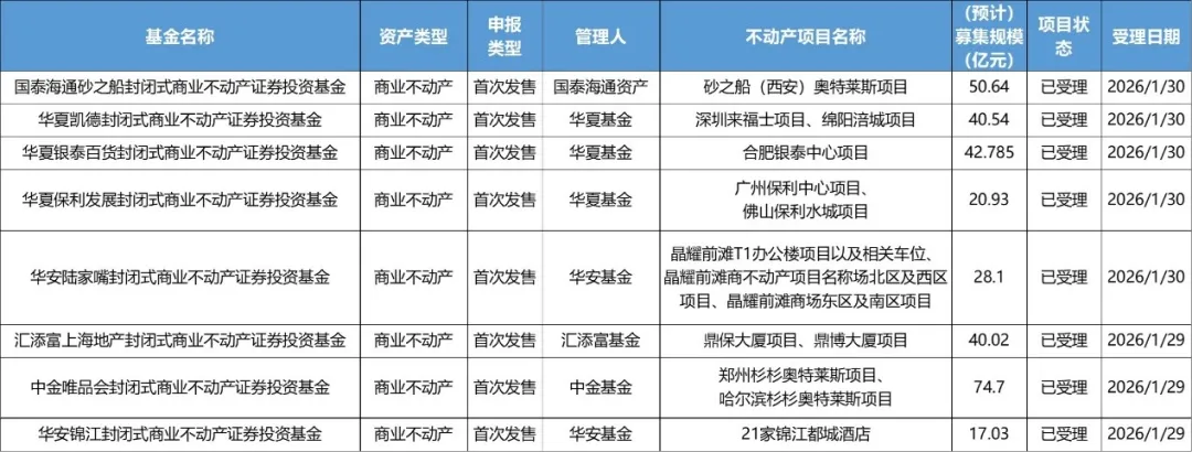 除了上述提到的項目外,首批獲得受理的還有華夏凱德封閉式商業(yè)不動產(chǎn)證券投資基金、華夏銀泰百貨封閉式商業(yè)不動產(chǎn)證券投資基金、華夏保利發(fā)展封閉式商業(yè)不動產(chǎn)證券投資基金、華安陸家嘴封閉式商業(yè)不動產(chǎn)證券投資基金、匯添富上海地產(chǎn)封閉式商業(yè)不動產(chǎn)證券投資基金,覆蓋央企、地方國企、民營企業(yè)、外資企業(yè)等多元主體。