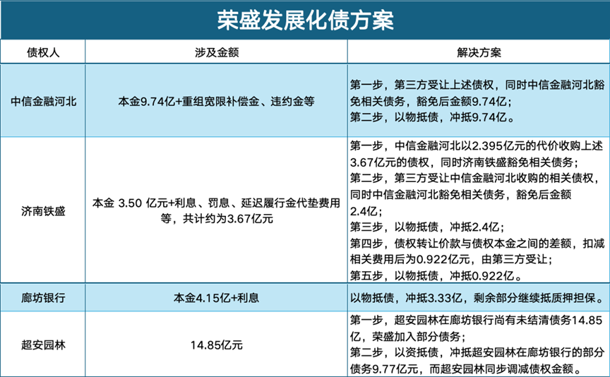 最新消息顯示,近日,榮盛發(fā)展發(fā)布了長達26頁的債務重組報告,通過債務轉(zhuǎn)讓、豁免、以物抵債、債務加入等方式進行化債。