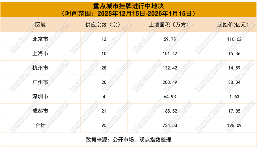 據(jù)觀點指數(shù)不完全統(tǒng)計,2025年12月15日-2026年1月15日期間,6個重點城市一共有95宗地塊處于掛牌進(jìn)行中,起始價198.09億元,面積724.53萬平方米,環(huán)比回升18.63%。