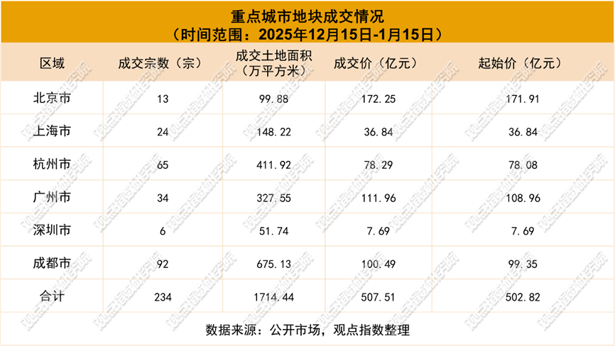 成交方面,據(jù)觀點指數(shù)不完全統(tǒng)計,2025年12月15日-2026年1月15日期間,6個重點城市一共有234宗地成交,成交價507.51億元,成交土地面積1714.44萬平方米,環(huán)比回升279.45%。