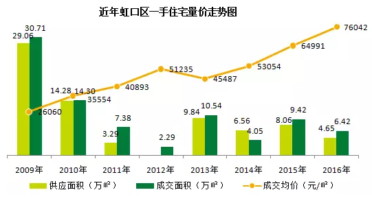 從近年虹口區(qū)一手住宅供求價走勢可以明顯看出,虹口區(qū)基本處于供不應(yīng)求的狀態(tài),自2011年上海限購以來,供求量均出現(xiàn)大幅下滑,但成交價格卻呈明顯上揚趨勢。據(jù)上海鏈家市場研究部數(shù)據(jù)顯示:截至目前,2016年虹口區(qū)一手住宅供應(yīng)量僅為4.65萬方,成交量為6.42萬方,成交均價卻已高達76042元/㎡,較去年上漲17%,而與2009年相比,8年不到房價翻了近3倍。