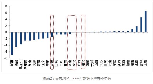 第二理由是部分地區(qū)洪澇災(zāi)害對工業(yè)生產(chǎn)產(chǎn)生了一定影響。然而,根據(jù)分析受災(zāi)省份工業(yè)生產(chǎn)后發(fā)現(xiàn),各省的受災(zāi)情況和工業(yè)生產(chǎn)減速情況并不完全匹配。例如,根據(jù)民政部發(fā)布的7月災(zāi)情分析報(bào)告,河北,湖北,安徽,河南受災(zāi)情況較重,而這四個(gè)省的工業(yè)增加至都只有輕微的減速,分別為5.1%、8.3%、7.7%、7.6%,比6月回落了0.1、0、1.4和0.6個(gè)百分點(diǎn)。湖南,貴州,江西,吉林,北京,四川等受災(zāi)區(qū),7月工業(yè)增加值增速甚至高于6月增速。而減速幅度最大的幾個(gè)省卻并非受災(zāi)區(qū),如新疆、西藏、海南分別7月工業(yè)增加值分別下降7、4.5、2.6個(gè)百分點(diǎn),無法用洪澇災(zāi)害的負(fù)面影響解釋。