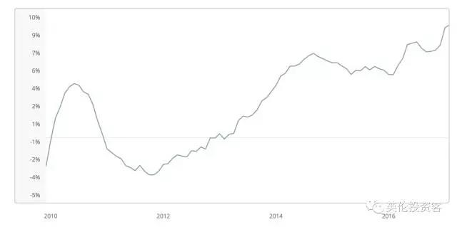 圖為Hometrack統(tǒng)計的曼徹斯特房價增長率變化圖,可以看到在經(jīng)歷了2012年的短暫下跌后,2013年開始曼徹斯特房價便以每年7%左右的速度不斷上漲。