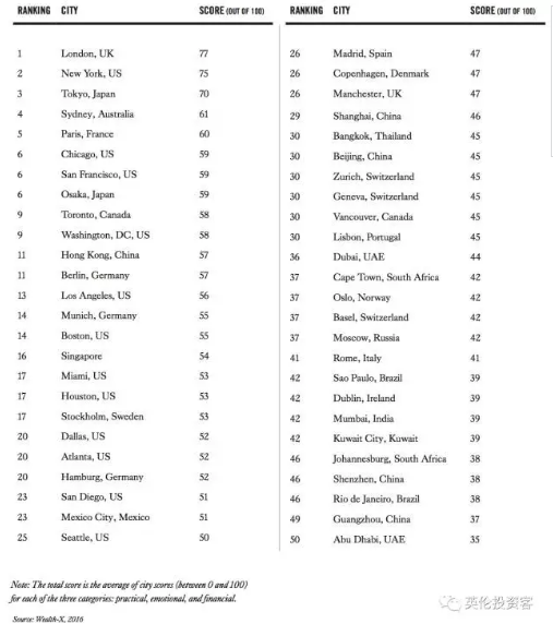 圖為世界各城市購房吸引力完整排名,香港排名第11,上海北京分別排名第29、30,深圳廣州排在46、49位。