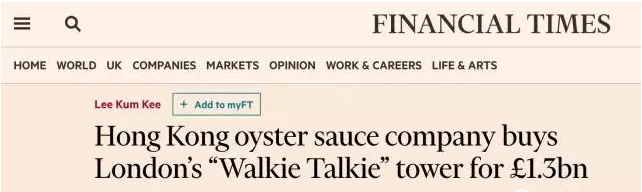 李錦記這筆投資同時(shí)也是英國(guó)歷史上成交金額最大的地產(chǎn)交易,超過(guò)了卡塔爾投資局11.75億英鎊拿下金絲雀碼頭金融城匯豐總部大樓的交易。