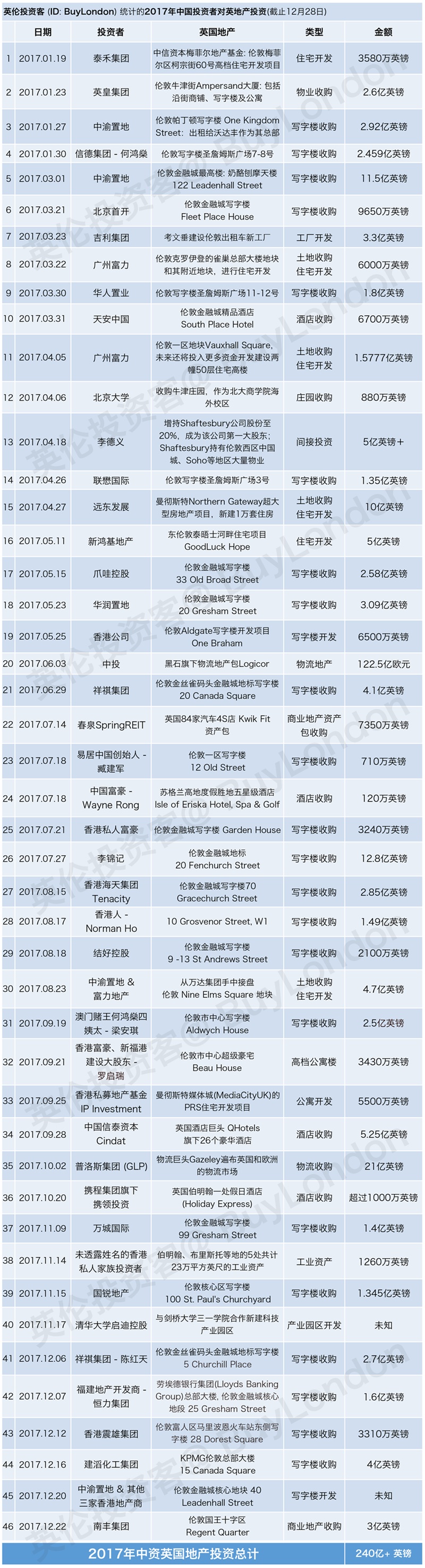 傅士鵬 馬上要進(jìn)入2018年了,回首2017,今年英國房地產(chǎn)總投資額將超過600億英鎊。由于英鎊下跌,海外買家成了絕對主力:中國、美國、德國占據(jù)榜單的前三位。