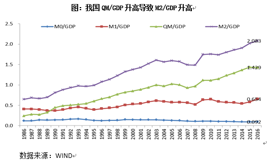 M1/GDP較為穩(wěn)定,M1占M2比例在減小,狹義貨幣沒有大量快速增加。數(shù)據(jù)顯示,1986-2016年,我國M2/GDP由65%上升至208%,上升速度比較快。從貨幣結(jié)構(gòu)的角度看,M2是由不同交易動機貨幣部分組成,現(xiàn)金和活期存款對應(yīng)交易動機部分,準貨幣對應(yīng)財富貯藏動機部分。M0/GDP、M1/GDP比值較為平穩(wěn),沒有出現(xiàn)明顯的上升或下降的變化趨勢,變化較為平緩,表明隨著GDP規(guī)模的擴大,經(jīng)濟活動的增加,M1既有效滿足了經(jīng)濟交易活動對貨幣的需求,又沒有出現(xiàn)明顯的過剩。另外,M1/M2在逐漸下降,表明在M2中M1部分占比在減少。因此,狹義貨幣M1沒有大量快速增加。