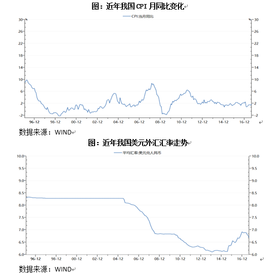 貨幣超發(fā),就是貨幣供給量超過貨幣需求量,將引起貨幣貶值,對內(nèi)貨幣貶值就是發(fā)生顯著通貨膨脹,對外貨幣貶值就是外匯匯率走高、人民幣匯率下降,因此CPI、匯率是衡量貨幣是否超發(fā)的有力工具指標。近年來,我國CPI大多數(shù)月份在2%附近,自1996年1月以來,CPI月均值為2.2%,遠低于新興經(jīng)濟和發(fā)展中經(jīng)濟體的8%,與發(fā)達經(jīng)濟體2%左右的通貨膨脹相當(dāng)。伴隨著廣義貨幣M2的大規(guī)模擴張,中國物價指數(shù)變化總體溫和,并沒有出現(xiàn)人們所擔(dān)心的物價大幅上漲的情況,尤其是2011以來CPI變化基本平穩(wěn)并保持在較低的水平。