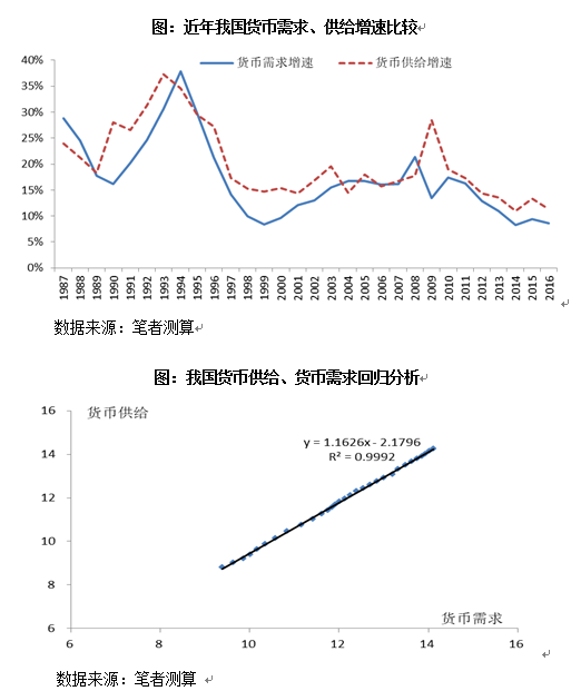 貨幣供給量與需求量相匹配,貨幣需求變動能解釋貨幣供給變動的99.9%。首先,對貨幣供給量、貨幣需求量取自然對數(shù)。然后,把貨幣供給作為因變量,貨幣需求作為自變量,進行回歸。結(jié)果非常顯著,貨幣需求變動能解釋貨幣供給變動的99.9%,也就是說貨幣供給的99.9%都能被貨幣需求給吸納消化掉,貨幣的供給量與貨幣的需求量相匹配。