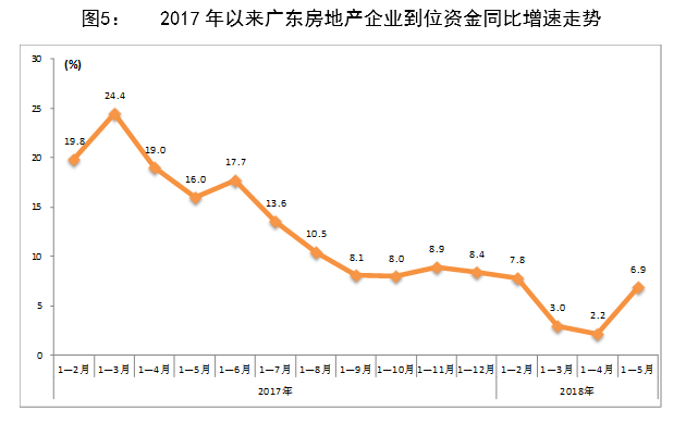1-5月,在調控政策日益嚴厲的背景下,廣東商品房銷售面積、銷售額同比增速呈現(xiàn)逆勢反彈,凸顯調控政策仍有進一步完善的空間;企業(yè)資金狀況有所改善,房地產(chǎn)完成投資、新開工面積同比增速繼續(xù)回落,土地購置面積和成交價款同比降幅持續(xù)收窄,反映企業(yè)對后市謹慎樂觀。