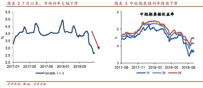 今年上半年,伴隨著去杠桿與財(cái)政緊約束的推進(jìn),中國(guó)宏觀經(jīng)濟(jì)出現(xiàn)明顯回落。與此同時(shí),中美貿(mào)易戰(zhàn)風(fēng)險(xiǎn)也在加大。為應(yīng)對(duì)內(nèi)憂外困局面,7月以來(lái),中國(guó)貨幣政策迎來(lái)邊際放松,市場(chǎng)流動(dòng)性偏緊的情況得到明顯緩解,貨幣市場(chǎng)利率大幅下滑。從1個(gè)月期限的Shibor來(lái)看,利率自6月高點(diǎn)4.15%回落至當(dāng)前的2.65%,下降了1.5個(gè)百分點(diǎn)。
