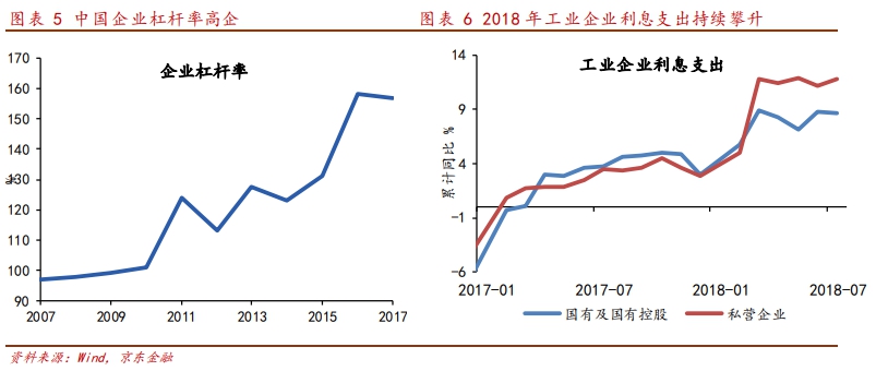 2008年之前,中國(guó)非金融企業(yè)杠桿率一直穩(wěn)定在100%以?xún)?nèi),全球金融危機(jī)后,加杠桿趨勢(shì)非常明顯,非金融企業(yè)杠桿率由2008年98%上升到2016年的158%,在全球范圍內(nèi)處于較高水平。伴隨著2017年中國(guó)的去杠桿政策,企業(yè)杠桿率持續(xù)攀升的局面有所遏制。同時(shí),去杠桿背景下,企業(yè)利息支出增長(zhǎng)較快,從2017年開(kāi)始,工業(yè)企業(yè)利息支出持續(xù)增長(zhǎng),特別是2018年前三個(gè)月,利息支出同比增速均超過(guò)10%,還債負(fù)擔(dān)增加明顯。