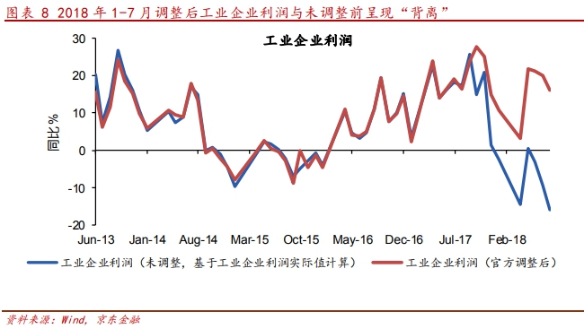 在我們看來(lái),當(dāng)前銀行放貸意愿下降與實(shí)體經(jīng)濟(jì)活力有限,與缺少投資回報(bào)率較高的項(xiàng)目有關(guān)。伴隨著中國(guó)經(jīng)濟(jì)回落,去杠桿、加強(qiáng)環(huán)保、企業(yè)稅收負(fù)擔(dān)加重、人力成本增加等原因,當(dāng)前中國(guó)企業(yè)盈利情況面臨困境。而房地產(chǎn)市場(chǎng)的一枝獨(dú)秀,也推升了租金成本,對(duì)其他行業(yè)發(fā)展造成了負(fù)面沖擊。從工業(yè)企業(yè)利潤(rùn)來(lái)看,今年以來(lái)根據(jù)工業(yè)企業(yè)利潤(rùn)計(jì)算的同比增速快速下降,7月下降幅度為16%,而統(tǒng)計(jì)局調(diào)整后的工業(yè)企業(yè)利潤(rùn)今年以來(lái)與之出現(xiàn)明顯偏差,二者背離,說(shuō)明統(tǒng)計(jì)數(shù)據(jù)的可信性存在商榷。如果以大規(guī)模工業(yè)企業(yè)退出規(guī)模以上企業(yè)的統(tǒng)計(jì)口徑作為解釋?zhuān)∏≌f(shuō)明,企業(yè)運(yùn)行存在困難,規(guī)模以上企業(yè)數(shù)量明顯減少的事實(shí)。