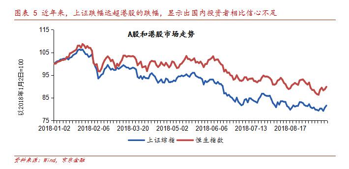 通過與歐美企業(yè)家、投資者的廣泛交流(今年6月,沈建光博士曾到訪歐洲16座城市與當(dāng)?shù)?0多家大型跨國企業(yè)的企業(yè)家交流),我們發(fā)現(xiàn),對于中美貿(mào)易戰(zhàn)與國內(nèi)去杠桿,A股的投資者要遠比美國、歐洲的投資者要悲觀,這反映在股市上,年初至今,上證指數(shù)下跌18%,深成指數(shù)跌幅超過25%,而港股跌幅相對較小,不超過10%。