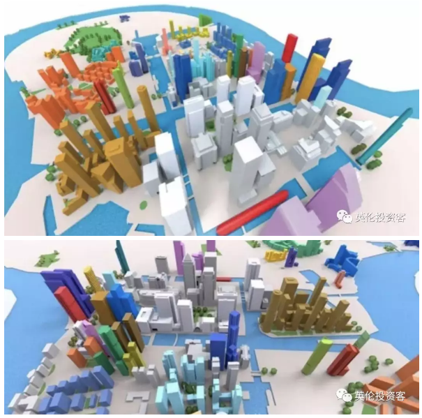 圖為金絲雀碼頭未來(lái)摩天高樓效果圖,圖中白色模型為已有建筑,彩色為在建、規(guī)劃獲批待建或已經(jīng)規(guī)劃待批的項(xiàng)目。