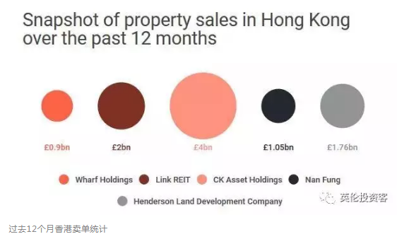 上圖看出,香港過去一年最大的地產(chǎn)賣單由李嘉誠(chéng)旗下長(zhǎng)實(shí)創(chuàng)造,賣了約40英鎊的香港房產(chǎn)。
