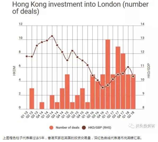 上圖橙色柱子代表著過去5年,香港買家在英國(guó)的投資交易量,深紅色曲線代表港幣兌英鎊匯率。