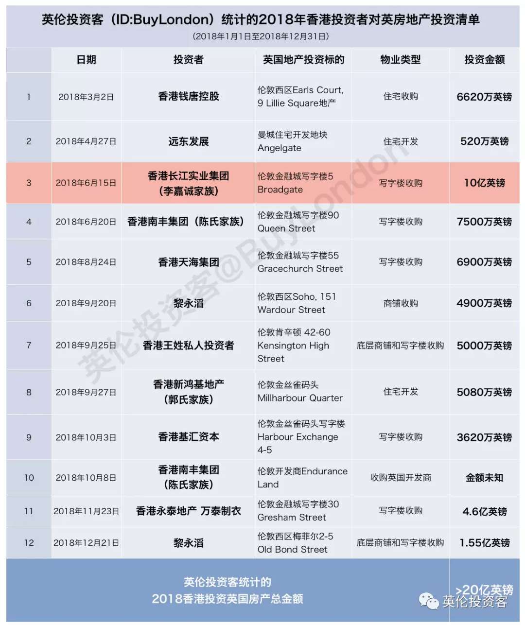 據(jù)英倫投資客(ID: BuyLondon)統(tǒng)計,2018年,僅香港本土家族財團(tuán)(不算在香港上市的內(nèi)地公司),就來英國買了超過20億英鎊(約200億港幣)的房產(chǎn),其中李嘉誠買的最多,一個人就花了10億英鎊。