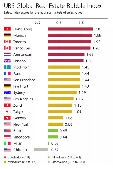 瑞銀2018報全球泡沫指數(shù)顯示,香港已經(jīng)成為全球房地產(chǎn)泡沫風(fēng)險最大的城市,此前一度占據(jù)榜首的倫敦排在第六位。