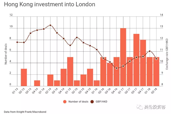 上圖橙色柱子代表著過去5年,香港買家在英國的投資交易量,深紅色曲線代表港幣兌英鎊匯率。