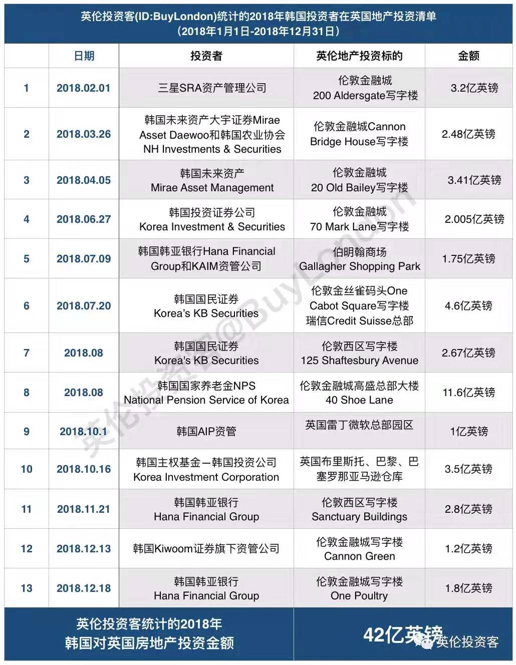 2018韓國(guó)對(duì)英地產(chǎn)投資清單