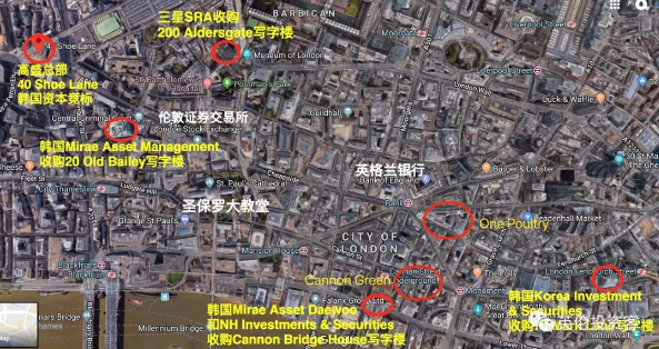 紅圈為韓國(guó)人2018年在倫敦金融城買(mǎi)下的7棟寫(xiě)字樓