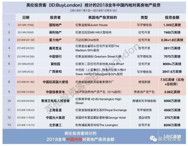 2018年中國(guó)內(nèi)地資本對(duì)英投資清單
