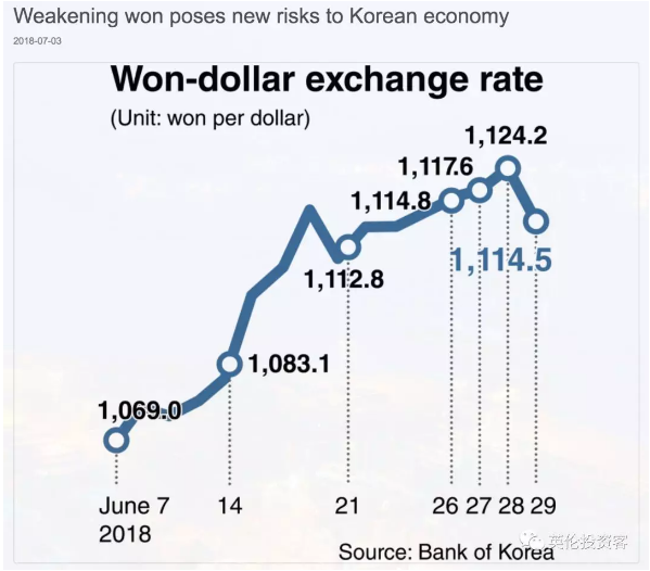 中美貿(mào)易戰(zhàn)也加速了韓幣貶值。上圖看出,韓元走弱和人民幣貶值的時(shí)間正好重合。