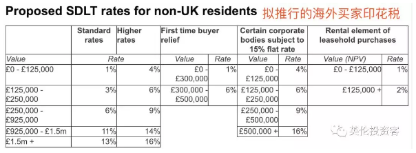 上圖為擬推行的海外買家在英國買房印花稅率,對比上一個表格,很明顯可以看出,對于海外買家來說,每個稅檔都比過去增加了1%。