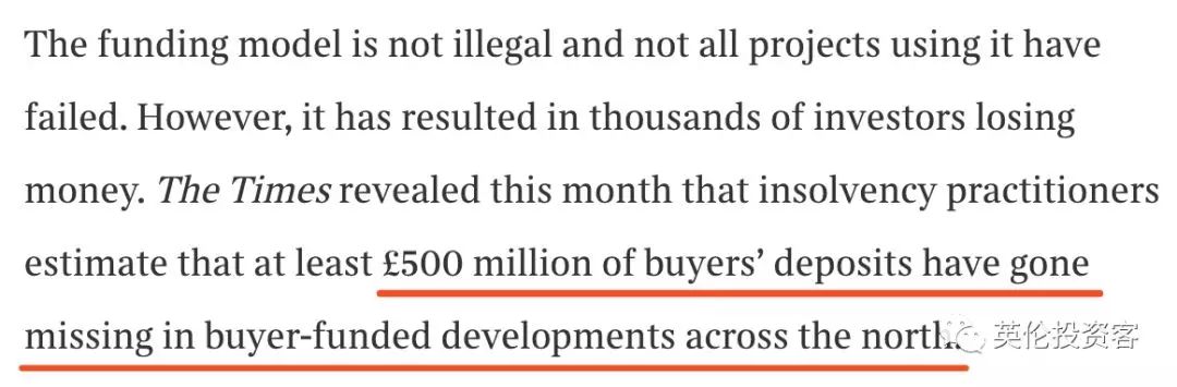 但是,這個模式的的確確已經(jīng)導致數(shù)以千計的投資者蒙受損失。不只亞洲投資者,《泰晤士報》剛剛完成的調(diào)查顯示,在由買家出資集資建設(shè)的項目中,至少已經(jīng)有5億英鎊的訂金受損。