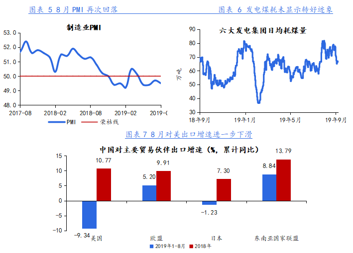 此外,筆者認(rèn)為當(dāng)前貨幣供應(yīng)量與經(jīng)濟(jì)基本面情況密切相關(guān)。就實際經(jīng)濟(jì)情況而言,近期中美磋商波折不斷,談判前景不明仍是短期內(nèi)影響中國經(jīng)濟(jì)走勢最大的不確定性;內(nèi)外壓力之下,7月工業(yè)生產(chǎn)、社零、基建、制造業(yè)、信貸等各項經(jīng)濟(jì)金融數(shù)據(jù)表現(xiàn)均難言樂觀;8月PMI則再次回落,發(fā)電煤耗等高頻數(shù)據(jù)也并未顯示出轉(zhuǎn)好跡象,已經(jīng)公布的外貿(mào)數(shù)據(jù)也表現(xiàn)不佳,對美出口增速進(jìn)一步下滑。