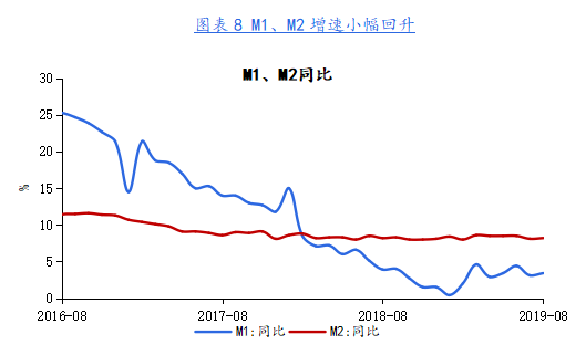 上述條件決定了當(dāng)前實體融資需求依然疲軟、銀行等金融機(jī)構(gòu)的風(fēng)險偏好也并未降低,而防風(fēng)險也未曾放松,央行堅持不搞“大水漫灌”,房地產(chǎn)融資政策的收緊仍在持續(xù)。在此背景下,8月M2同比增長8.2%,較7月小幅回升0.1%;M1增速為3.4%,小幅改善0.3%,整體仍然偏弱。當(dāng)然,伴隨著9月全面降準(zhǔn)的實施,后續(xù)貨幣供應(yīng)量增速有望反彈。