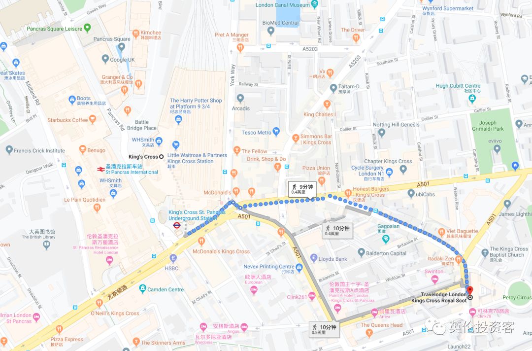 如下圖所示,從國王十字火車站到Travelodge酒店的步行距離只有9分鐘。
