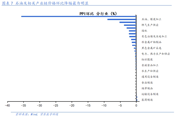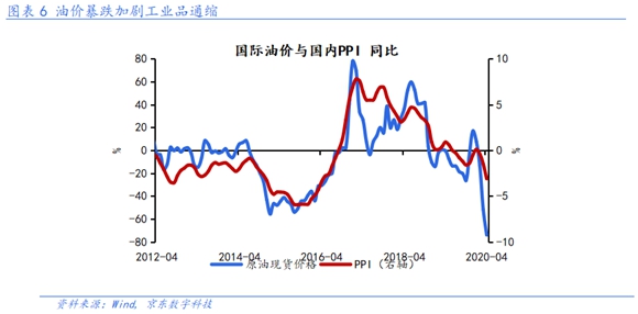 油價(jià)大跌影響下,PPI降幅加深。原油作為“大宗之母”,涉及產(chǎn)業(yè)鏈眾多,是PPI定價(jià)的核心要素,歷史數(shù)據(jù)顯示國際油價(jià)與國內(nèi)PPI關(guān)聯(lián)度高。4月布倫特油價(jià)同比跌幅高達(dá)74%,而中國PPI同比也降至-3.1%。細(xì)分行業(yè)來看,石油及相關(guān)產(chǎn)業(yè)鏈PPI環(huán)比降幅最為明顯,比如油氣開采、石油煤炭加工、化學(xué)制造、燃?xì)馍a(chǎn)供應(yīng)、造紙、有色黑色加工等。此外,油價(jià)下行也會通過交通工具燃料、水電燃料等分項(xiàng)拖累CPI非食品價(jià)格。