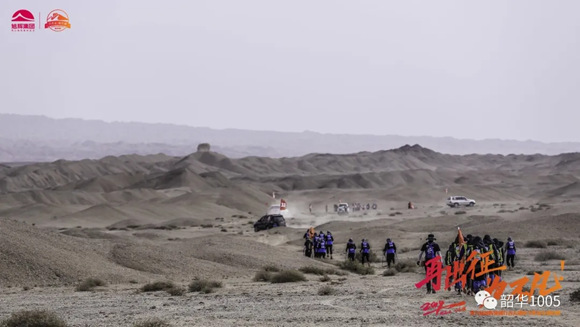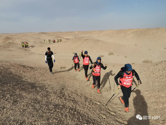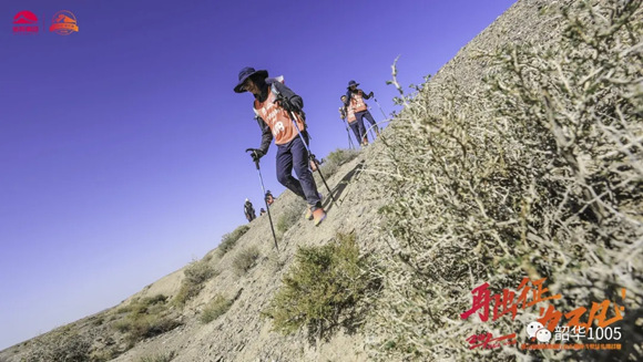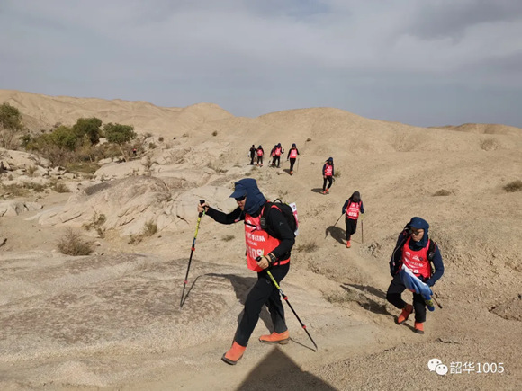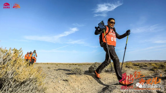呯!主持人的一聲槍鳴,期待已久的“戈6”拉開了帷幕!33支戰(zhàn)隊(duì)、360位“戈友”象一位位枕戈待旦的勇士,迫不及待地魚貫而出,一雙雙堅(jiān)毅有力的腳步踩在荒漠上,伴著登山杖撞擊荒沙,唰!唰!唰!像一首節(jié)奏感強(qiáng)烈的生命交響曲,響徹云霄,動(dòng)人心弦、催人奮進(jìn)!也許如林中董事長所講:第一天激動(dòng)又好奇,吹著喇叭唱著歌;第二天安靜了,因?yàn)轶w力透支,都是憑著毅力在走;第三天死的心都有,靠的是靈魂和信仰;到了第四天,就看到了希望。的確,第一天各支戰(zhàn)隊(duì)都恨不得用上洪荒之力,卯足勁兒往前沖,你追我趕,揚(yáng)起身后的荒沙留下一片片濃濃的黃煙、一串串又長又深的腳印……