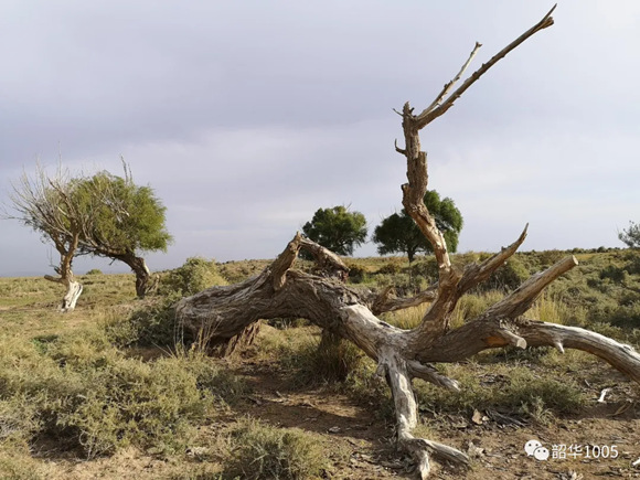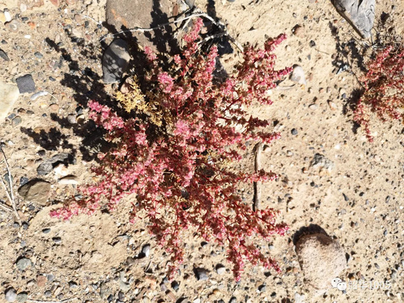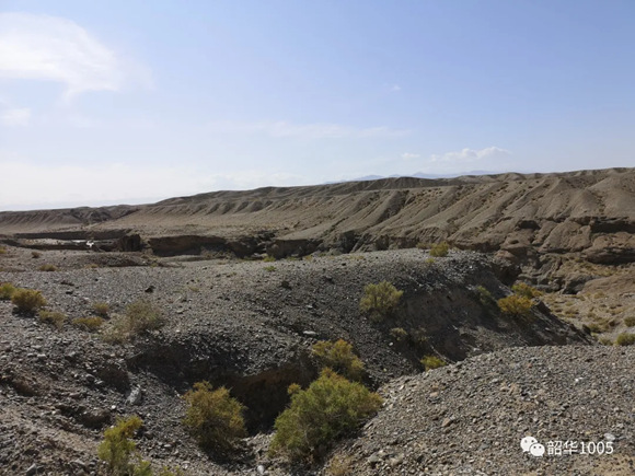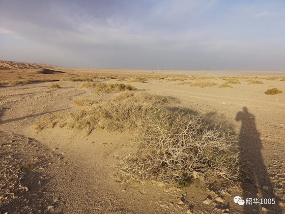 大漠孤煙直,長河落日?qǐng)A;勸君更盡一杯酒,西出陽關(guān)無故人!古詩人既描繪了大漠的雄渾與壯闊,也描寫了大漠的蒼茫和寂廖!行走在戈壁猶如進(jìn)入無人的原野,不要說人,就是動(dòng)物也行蹤罕跡。一眼望去,連綿起伏的山丘與天相連,除了黃色還是黃色,藍(lán)天也顯得暗淡許多,沒有一絲綠意,滿目蒼涼。地面布滿了粗砂、礫石,雖然隔著厚實(shí)的鞋底,但踩上腳板底還是隱隱作痛。一條條干涸的河溝橫七豎八地橫亙其中,麻黃草、駱駝刺、紅柳、沙拐棗,一棵、二棵零零星星地點(diǎn)綴著這無邊無際的戈壁,多多少少帶來了些許的生氣,尤顯彌足珍貴!只有置身其中才讓人真正領(lǐng)會(huì)“窮荒絕漠鳥飛盡,萬磧千山夢(mèng)猶懶”!