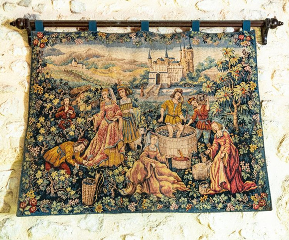 一邊品酒,一邊欣賞墻上一幅掛毯。這是描繪傳統(tǒng)的采摘葡萄和釀酒勞動的畫作,對照剛才所聞所見,感嘆歷史的變遷。