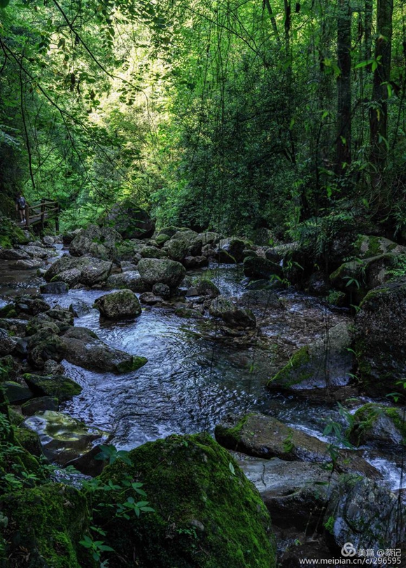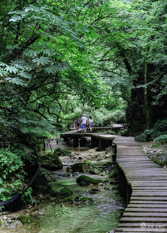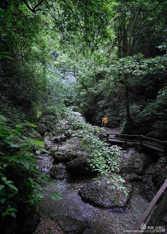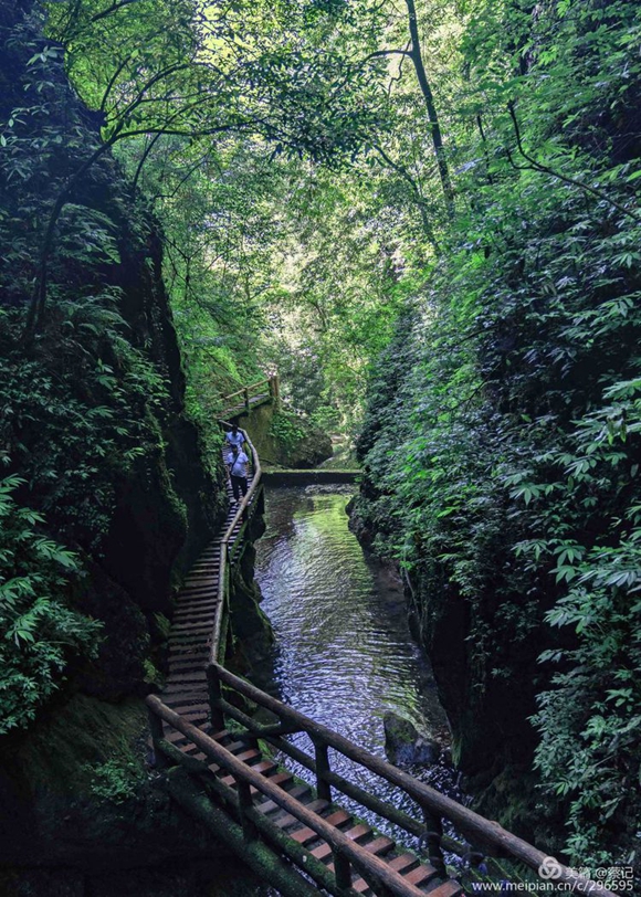 在青城后山沿溪上行,溪流時緩時急,水聲潺潺;林木遮天蔽日,青翠四合;棧道曲折延伸,沒入幽深。