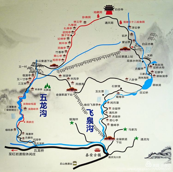 后山有飛泉溝(10公里)和五龍溝(8公里)兩條溪流,途經(jīng)眾多石灘、翠堤、橫橋、棧道、步梯、草亭,步移景換,引人入勝。