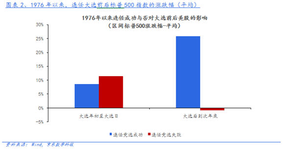 1)在連任競(jìng)選中,連任成功后的股市表現(xiàn)往往強(qiáng)于連任失敗。1976年以來的7屆連任大選中,大選前美股均以上漲為主;但在大選之后至次年年底,連任成功下標(biāo)普500平均上漲25.9%,連任失敗下標(biāo)普500平均下跌0.82%。
