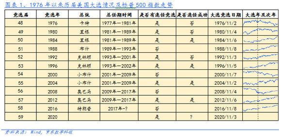 歷史上,美國(guó)的選舉周期對(duì)美股表現(xiàn)有較為明顯的影響。70年代以來,世界金融自由化的格局基本確立,在1976年-2016年的11次大選中,有4次沒有連任競(jìng)選(現(xiàn)任總統(tǒng)不再參選),剩下的7次連任競(jìng)選(現(xiàn)任總統(tǒng)參選)中有4次連任成功,另有3次連任失??;共產(chǎn)生了4位共和黨總統(tǒng),3位民主黨總統(tǒng)。