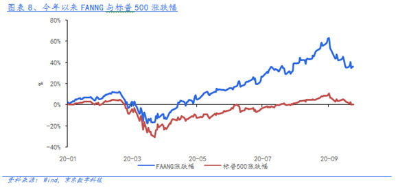 首先,財(cái)政救助計(jì)劃難產(chǎn),使股市資金面"舊力已去,新力未生"。3月25日美國(guó)通過的2.2萬億財(cái)政救助計(jì)劃中,約22%向企業(yè)提供薪資保障、補(bǔ)貼和貸款,約27%向居民派發(fā)現(xiàn)金支票和擴(kuò)大失業(yè)補(bǔ)助。前者直接改善了企業(yè)的經(jīng)營(yíng)能力和盈利狀況;而后者則通過居民儲(chǔ)蓄流入股市。在常規(guī)收入下降和社交隔離后消費(fèi)場(chǎng)景減少的影響下,得到補(bǔ)貼的居民部門儲(chǔ)蓄率開始上升,補(bǔ)貼資金大量流入股票市場(chǎng),并推升股價(jià)走高。據(jù)統(tǒng)計(jì)2月至6月期間,救助家庭在股票交易上大幅提升,美股市場(chǎng)散戶交易占比提升了100%-150%。但隨著兩黨在大選前分歧加大,自8月開始新一輪財(cái)政救助計(jì)劃遲遲未能達(dá)成一致,原計(jì)劃的資金已經(jīng)用盡,新的補(bǔ)貼卻無法落地,這對(duì)企業(yè)盈利和股市資金面均造成負(fù)面影響。
